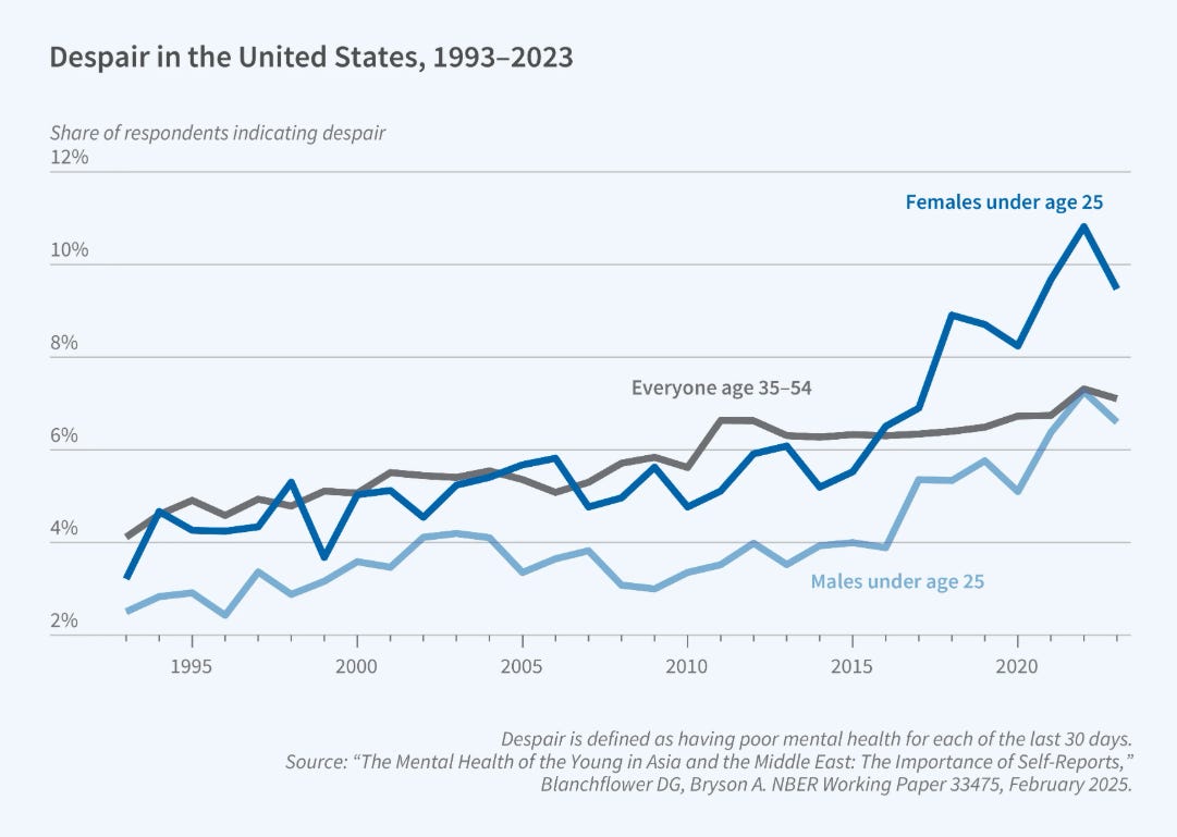 A new NBER paper and report analyzed mental health trends around the world. Historically, happiness was highest among the young and the old, with a dip in midlife (the proverbial midlife crisis). This pattern existed for nearly every country and was even observed in great apes. But starting in the early 2010s, researchers observe a sharp decline in life satisfaction among youth, and rises in youth anxiety, depression, and suicide. In the U.S., the share of young people experiencing despair, defined as reporting poor mental health every day for the last 30 days, rose from about 3% for boys and girls in 1993 to 6.6% for boys and 9.4% for girls in 2023; similar trends exist for other countries. This research suggests that youth around the world are suffering from a mental health epidemic. It forces us to ask: what has changed? Why are young people around the globe struggling at the same time?1